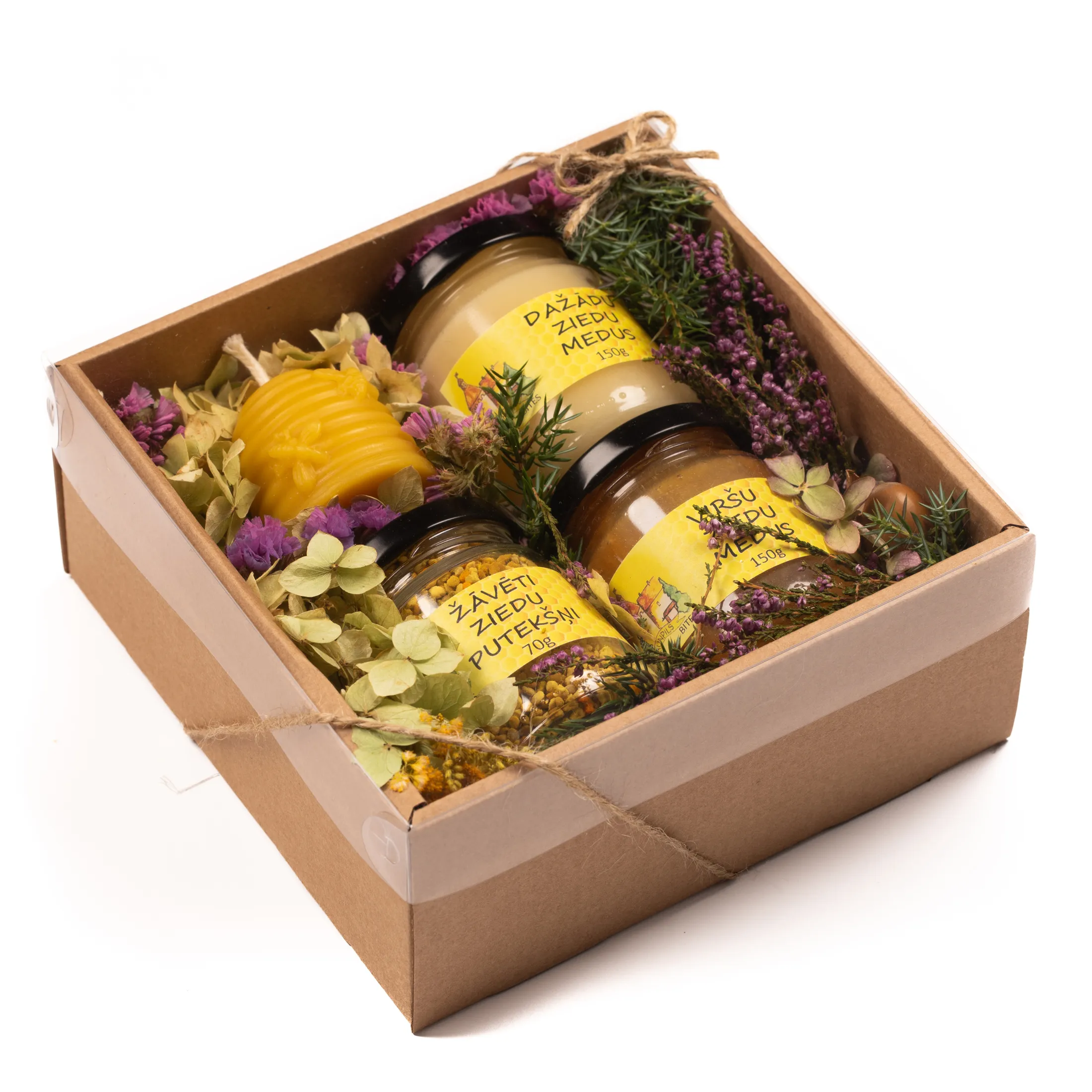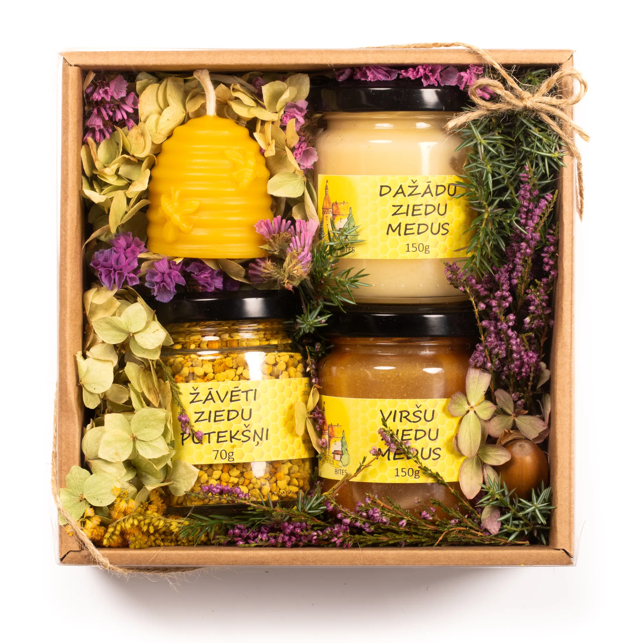 Katra dāvana tiek radīta ar īpašu rūpību, izmantojot mūsu pašu biškopības produktus un pašu audzētas, kaltētas puķes noformējumā.