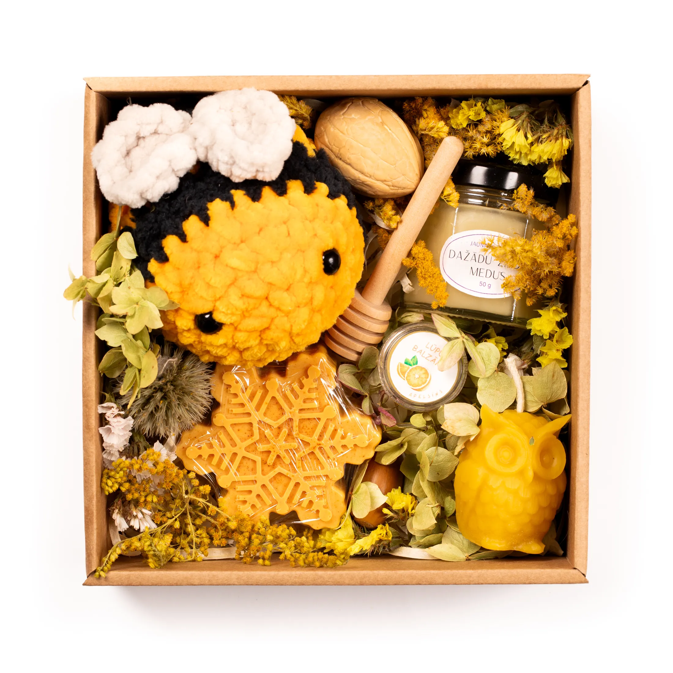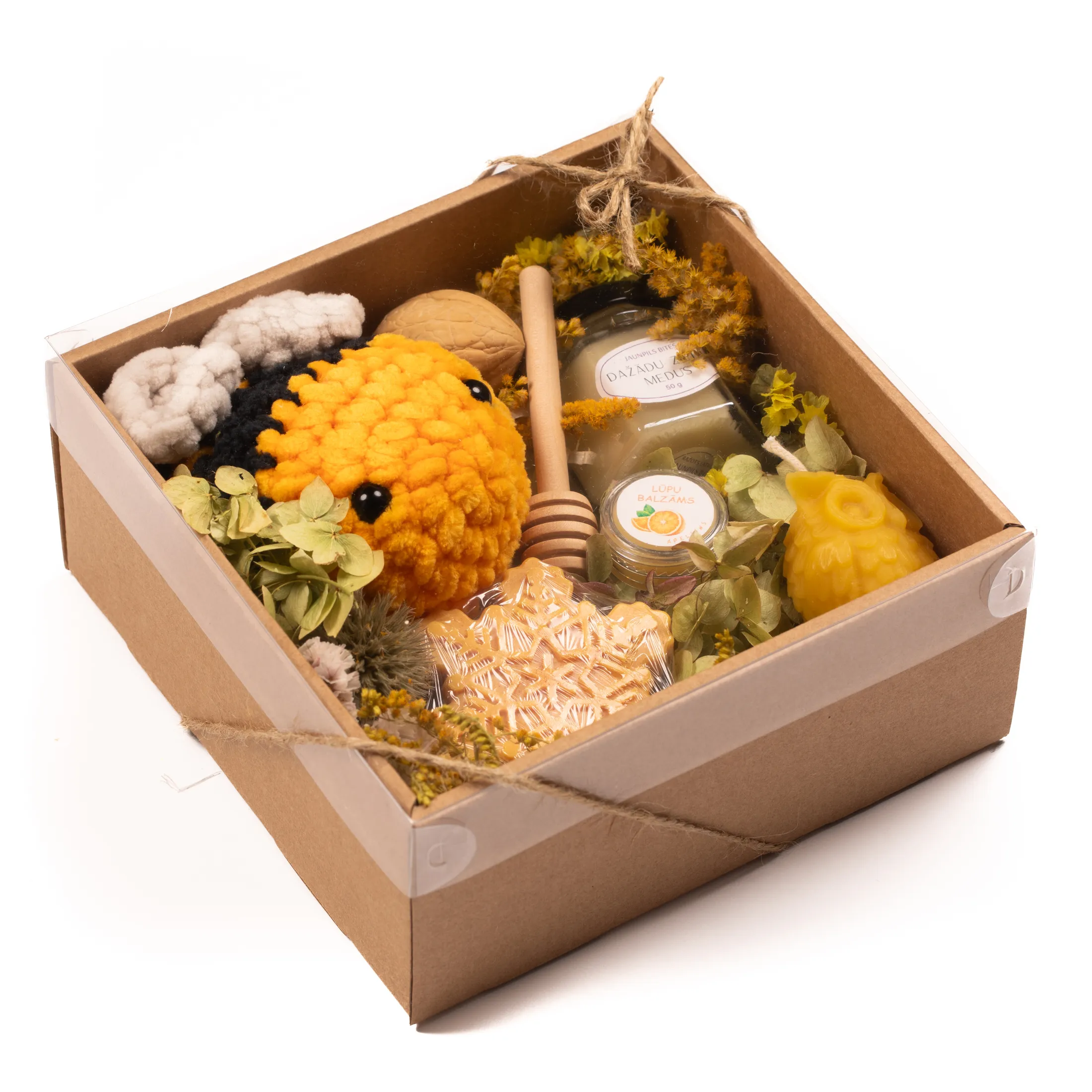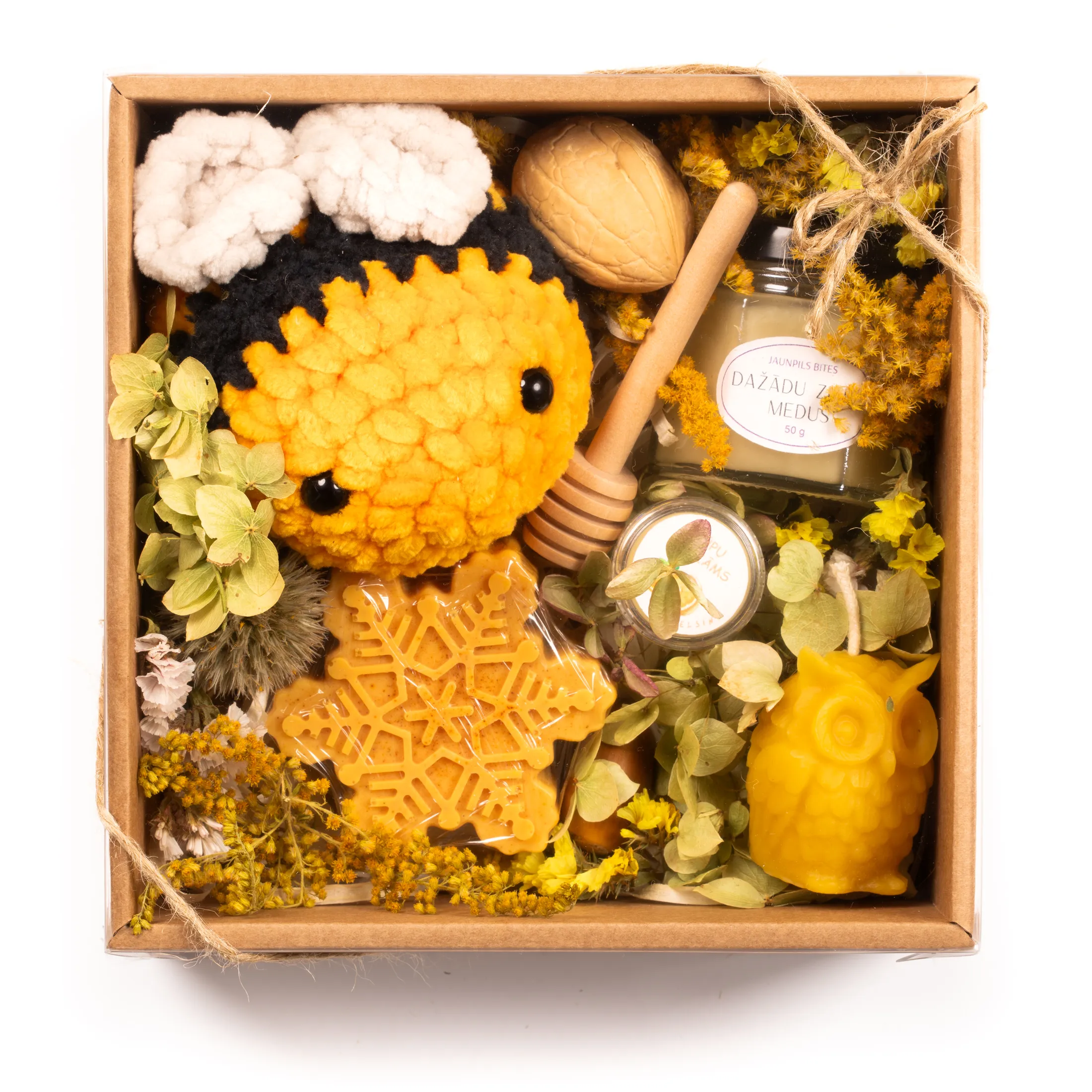 Katra dāvana tiek radīta ar īpašu rūpību, izmantojot mūsu pašu biškopības produktus un pašu audzētas, kaltētas puķes noformējumā.