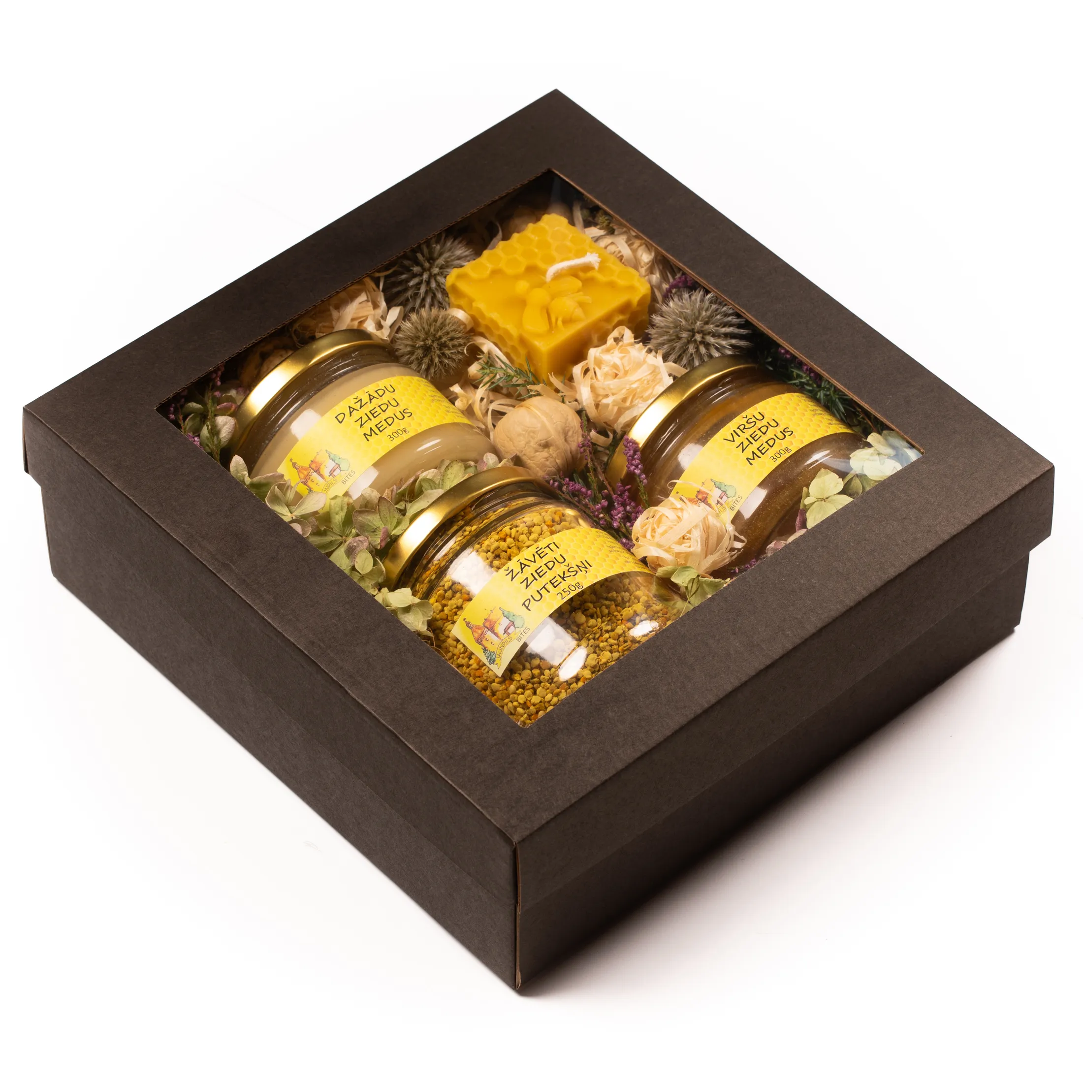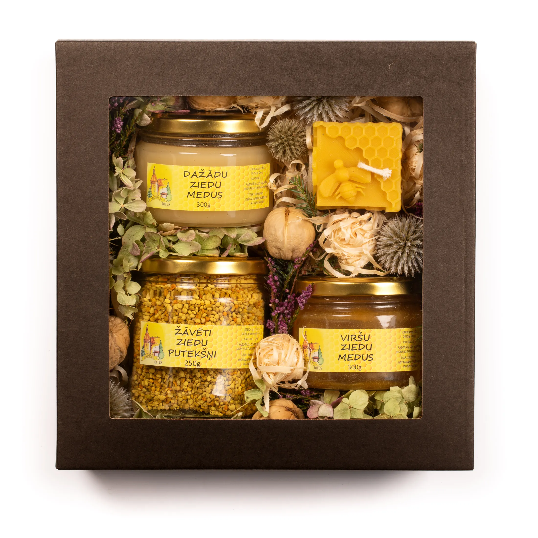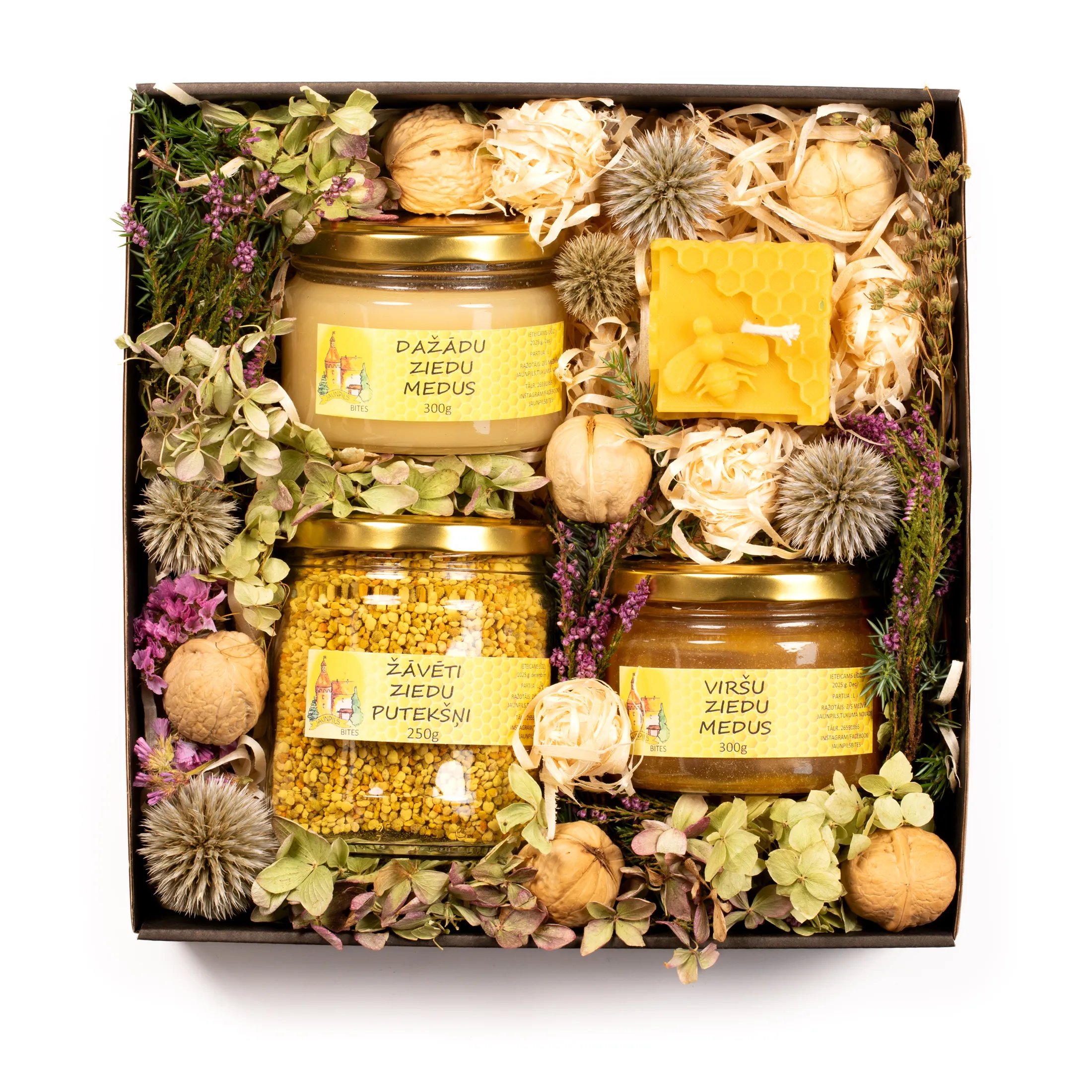 Katra dāvana tiek radīta ar īpašu rūpību, izmantojot mūsu pašu biškopības produktus un pašu audzētas, kaltētas puķes noformējumā.