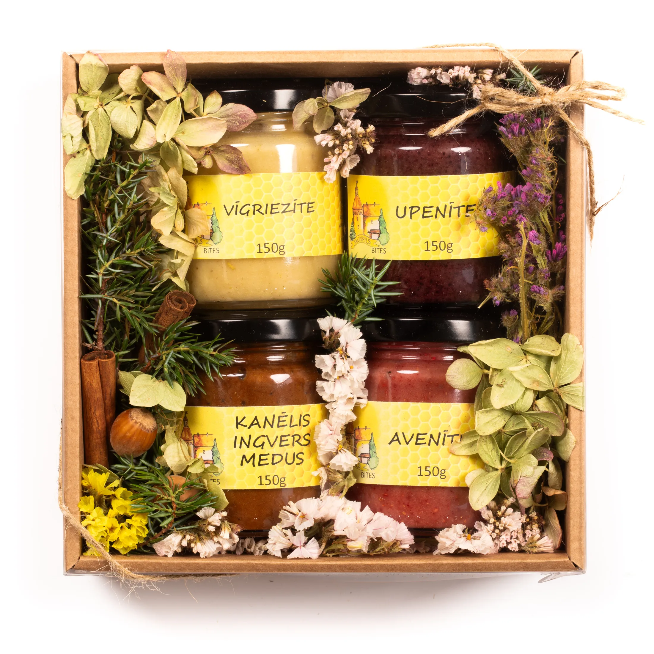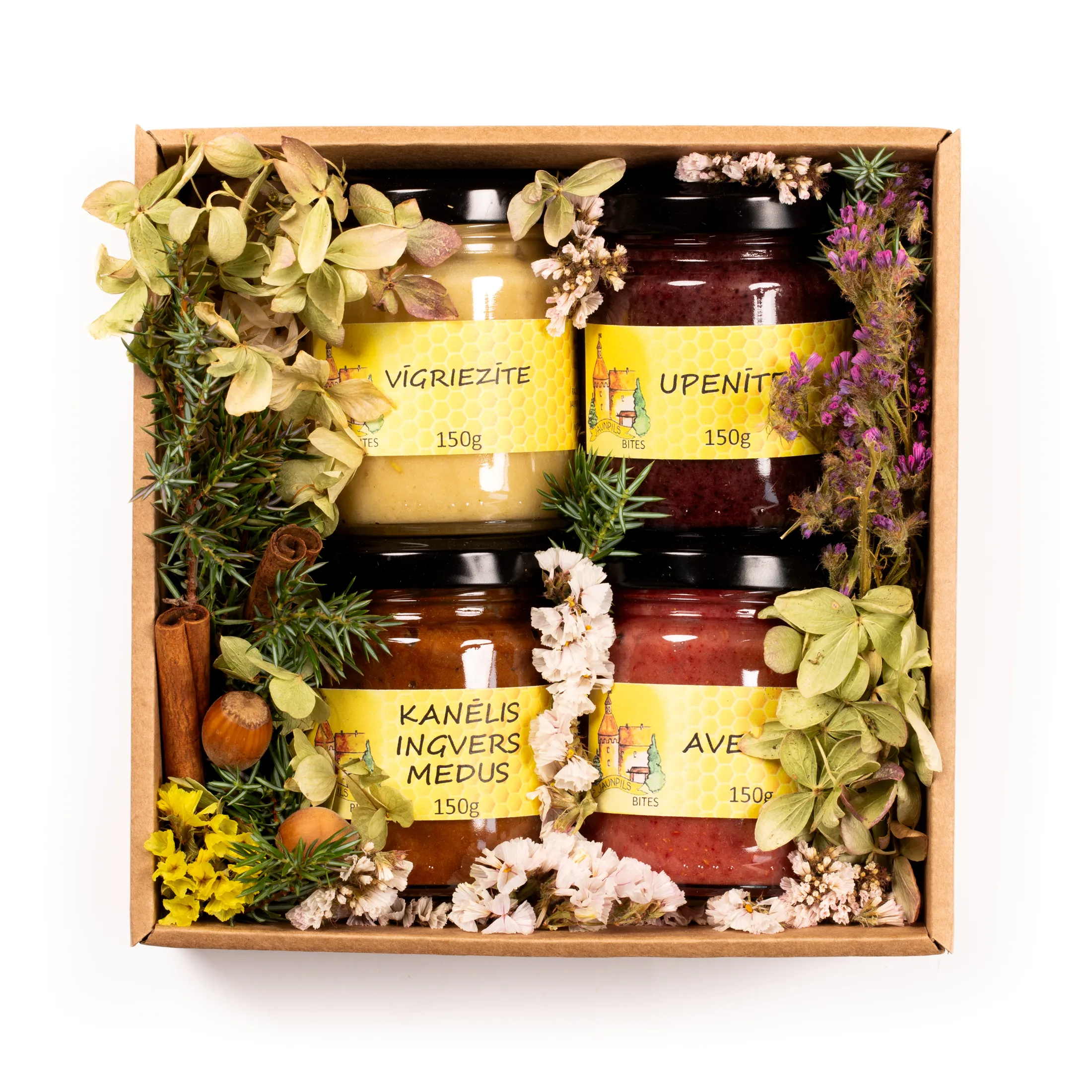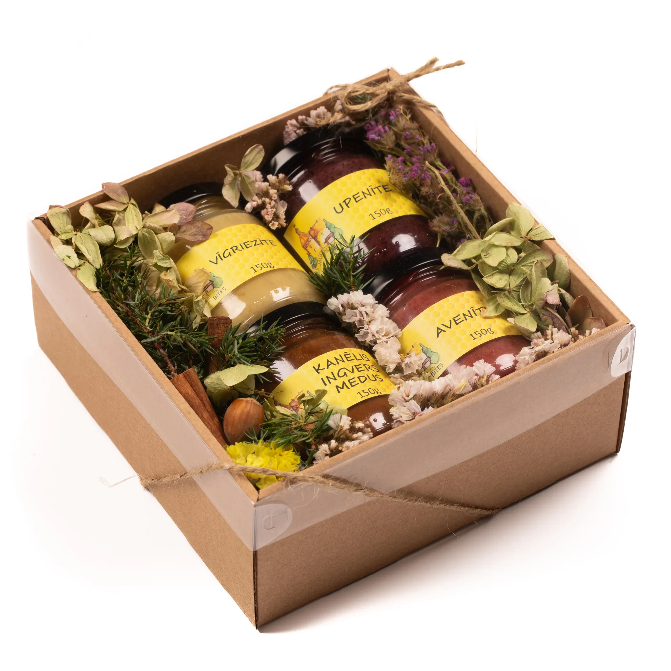 Katra dāvana tiek radīta ar īpašu rūpību, izmantojot mūsu pašu biškopības produktus un pašu audzētas, kaltētas puķes noformējumā.