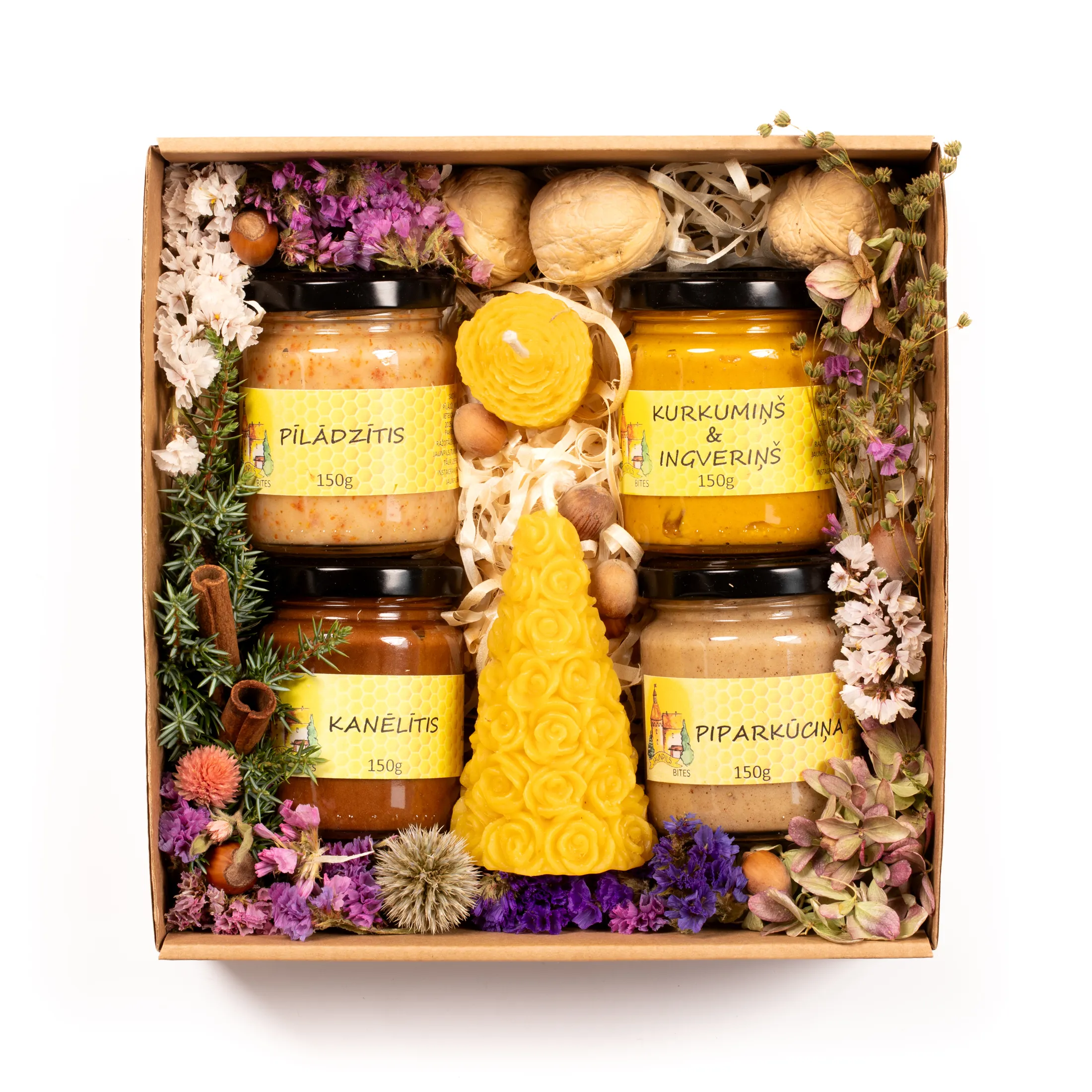 Katra dāvana tiek radīta ar īpašu rūpību, izmantojot mūsu pašu biškopības produktus un pašu audzētas, kaltētas puķes noformējumā.
