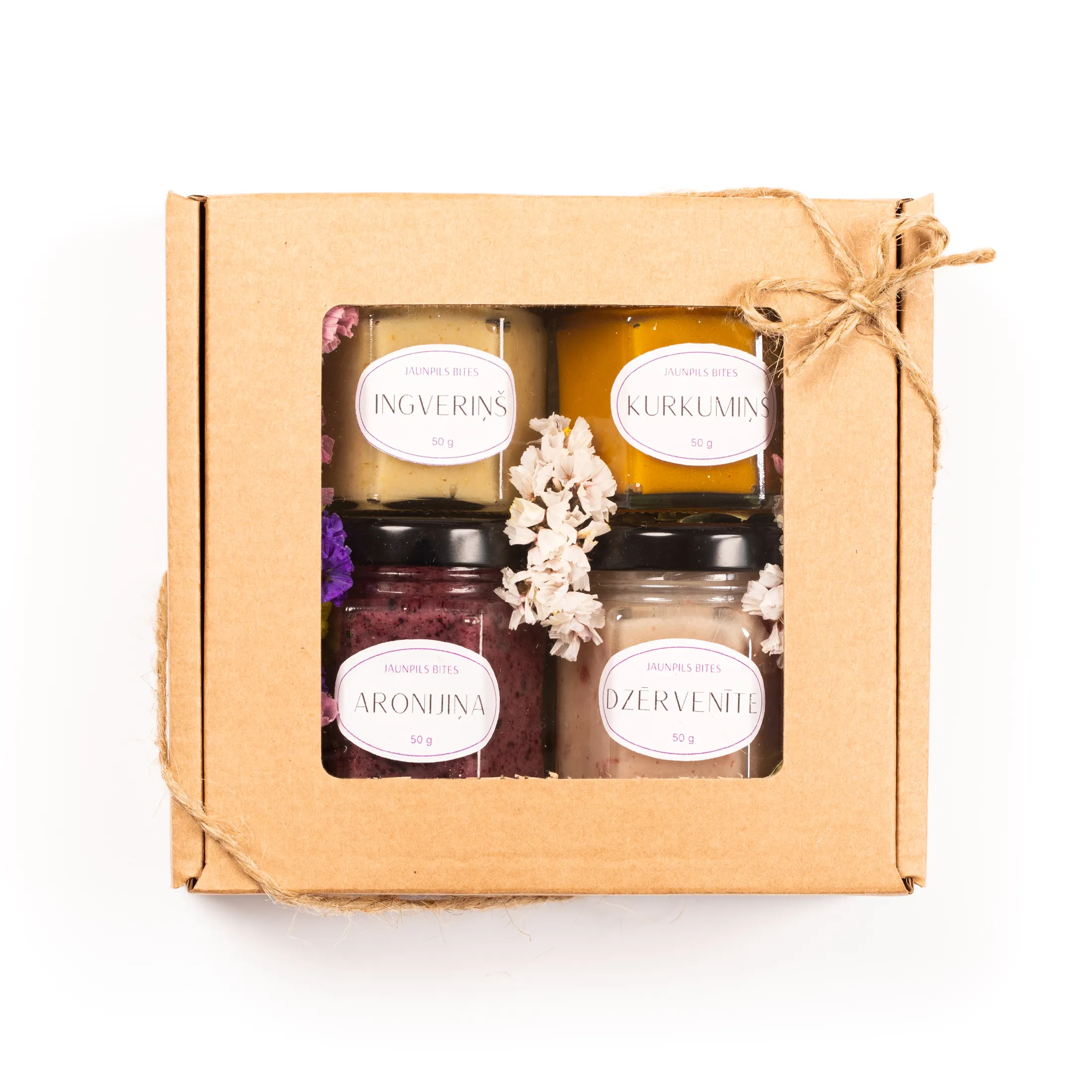 Katra dāvana tiek radīta ar īpašu rūpību, izmantojot mūsu pašu biškopības produktus un pašu audzētas, kaltētas puķes noformējumā.