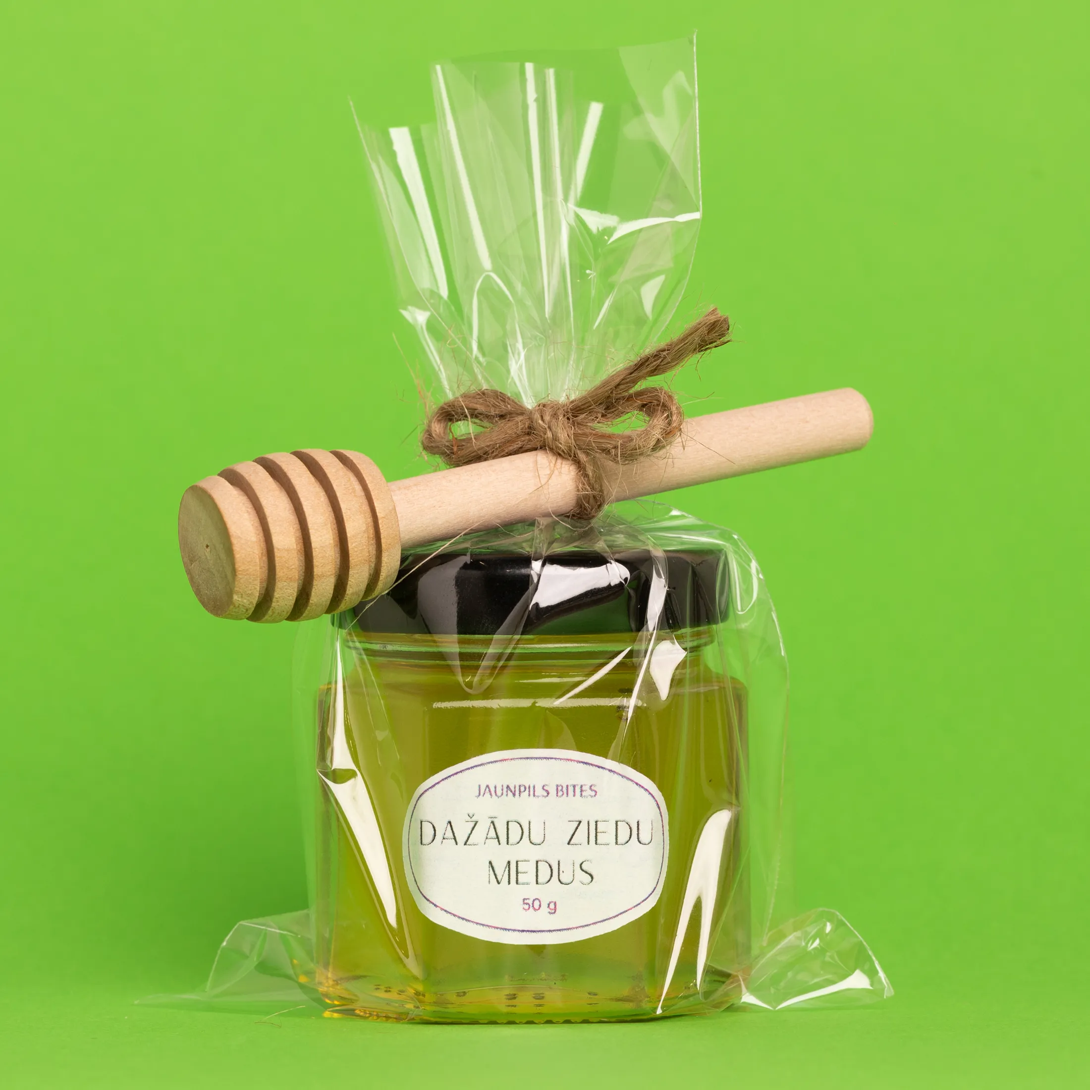 Caurspīdīgs maisiņš apsiets ar aukliņu un pievienota koka medus karotīte.
