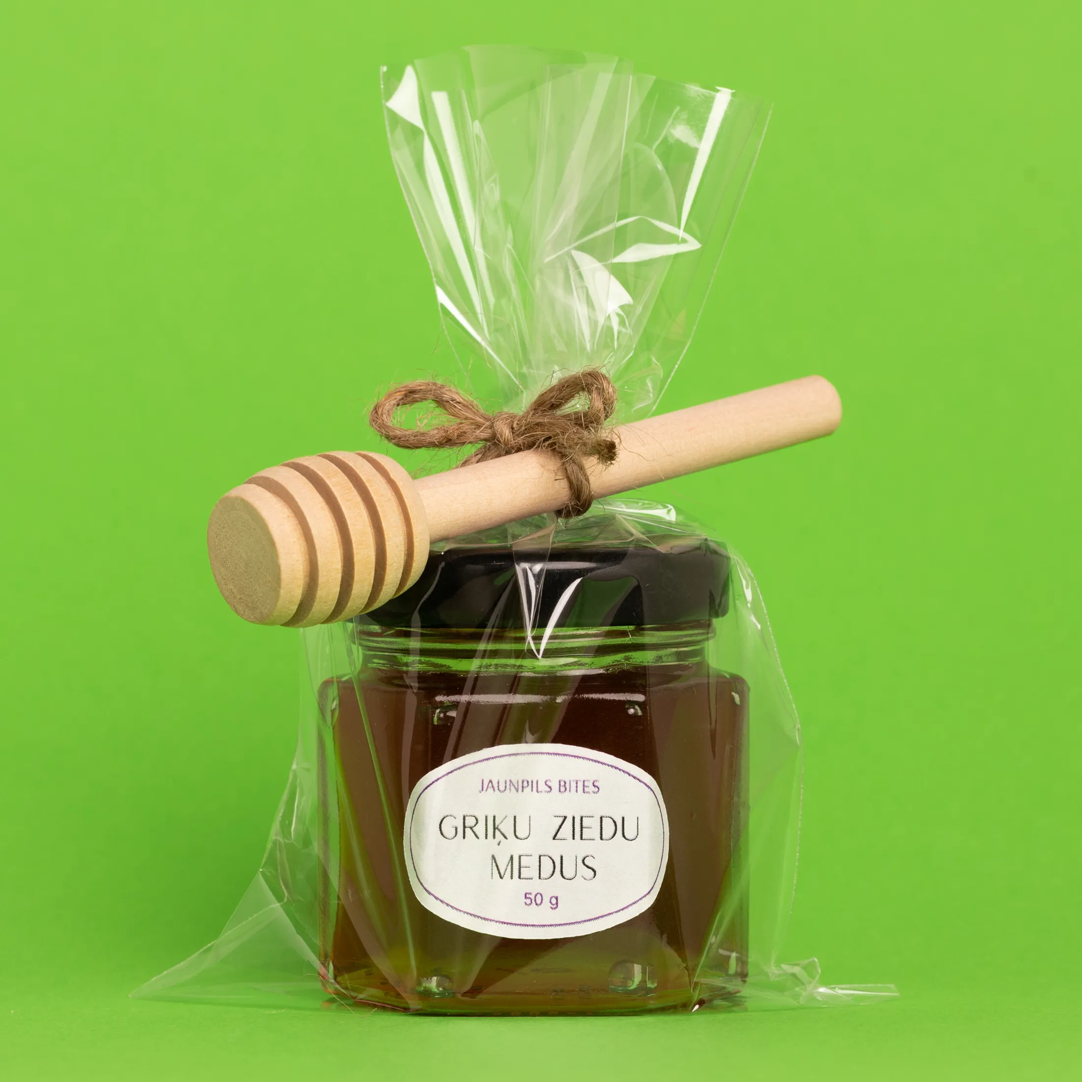 Caurspīdīgs maisiņš apsiets ar aukliņu un pievienota koka medus karotīte.