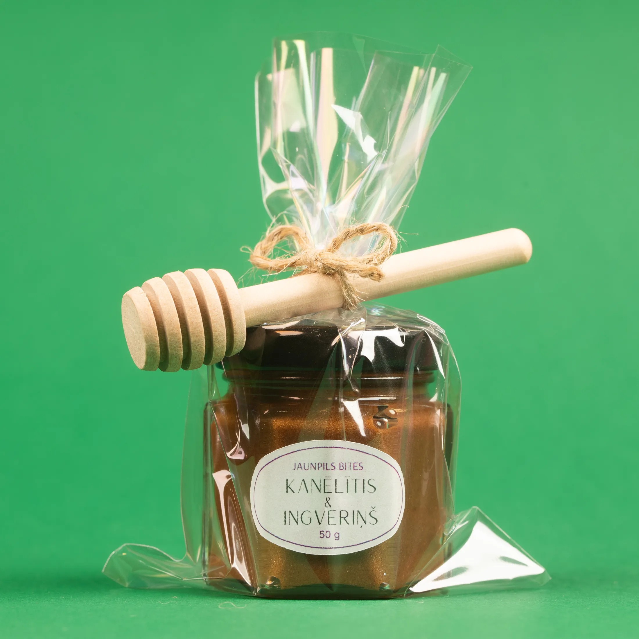 Caurspīdīgs maisiņš apsiets ar aukliņu un pievienota koka medus karotīte.