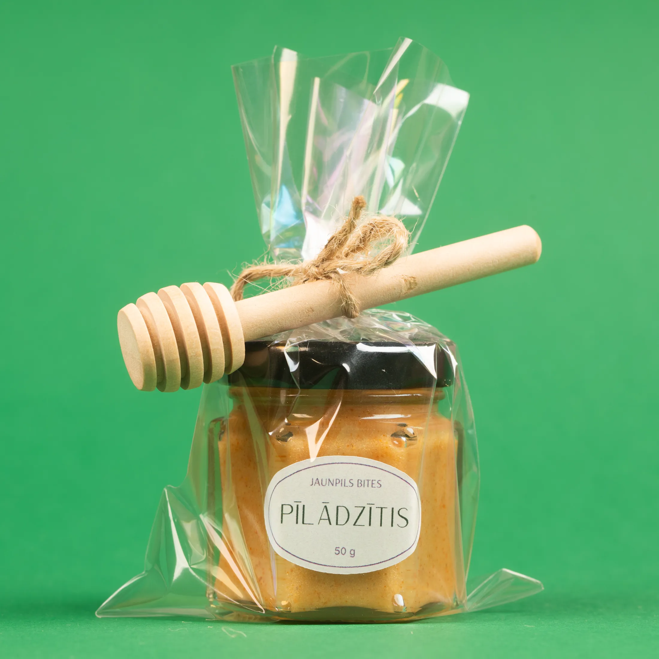 Caurspīdīgs maisiņš apsiets ar aukliņu un pievienota koka medus karotīte.