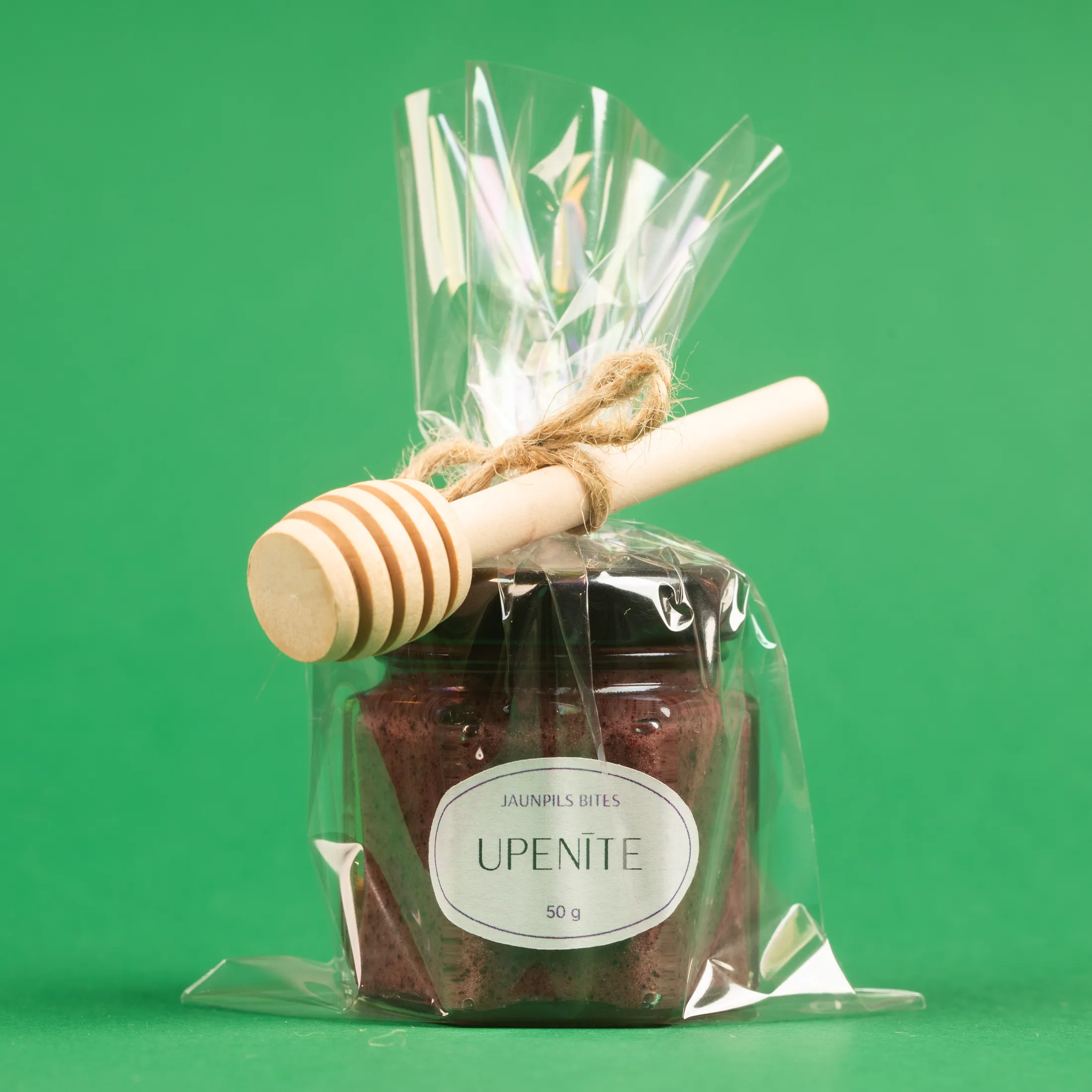 Caurspīdīgs maisiņš apsiets ar aukliņu un pievienota koka medus karotīte.