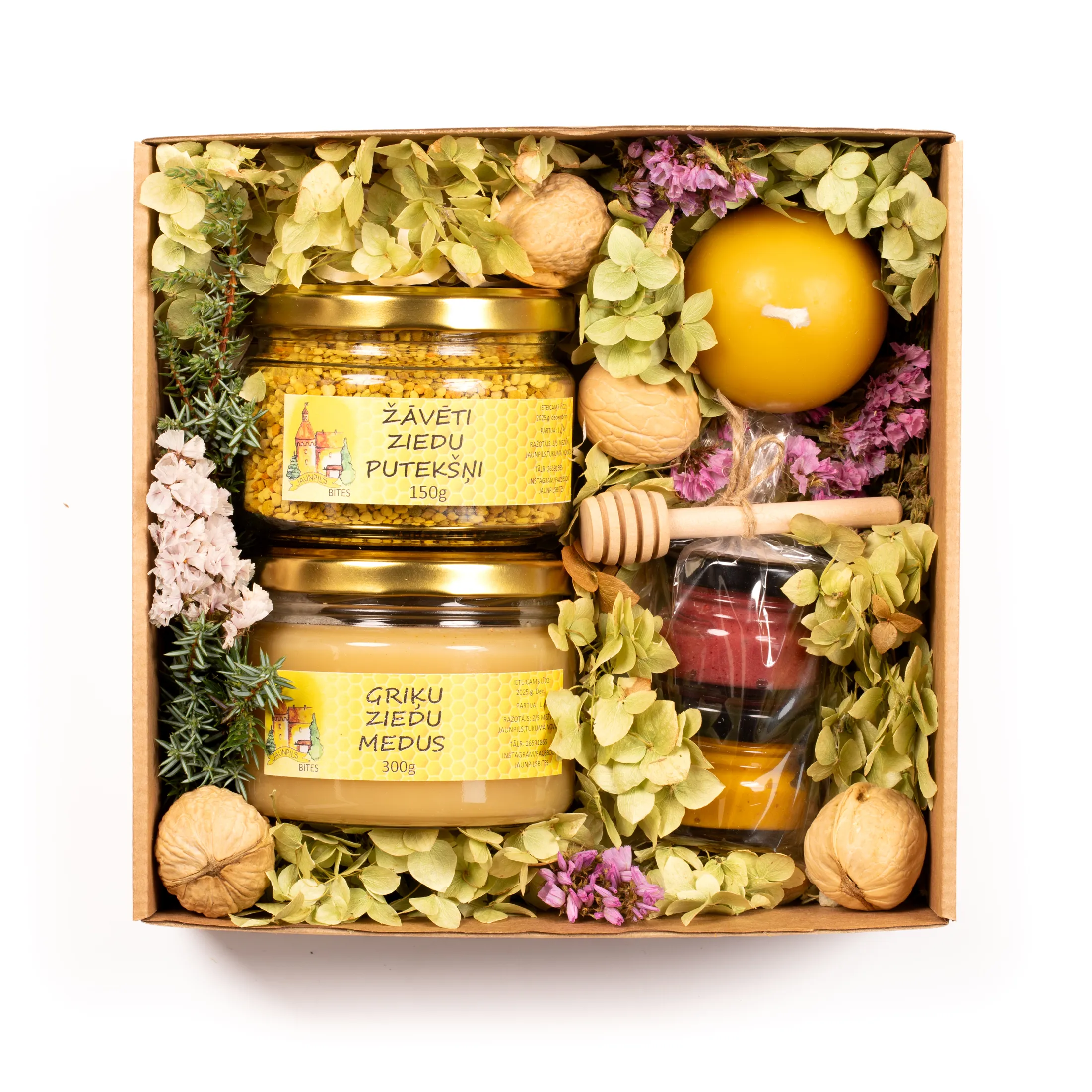 Katra dāvana tiek radīta ar īpašu rūpību, izmantojot mūsu pašu biškopības produktus un pašu audzētas, kaltētas puķes noformējumā.